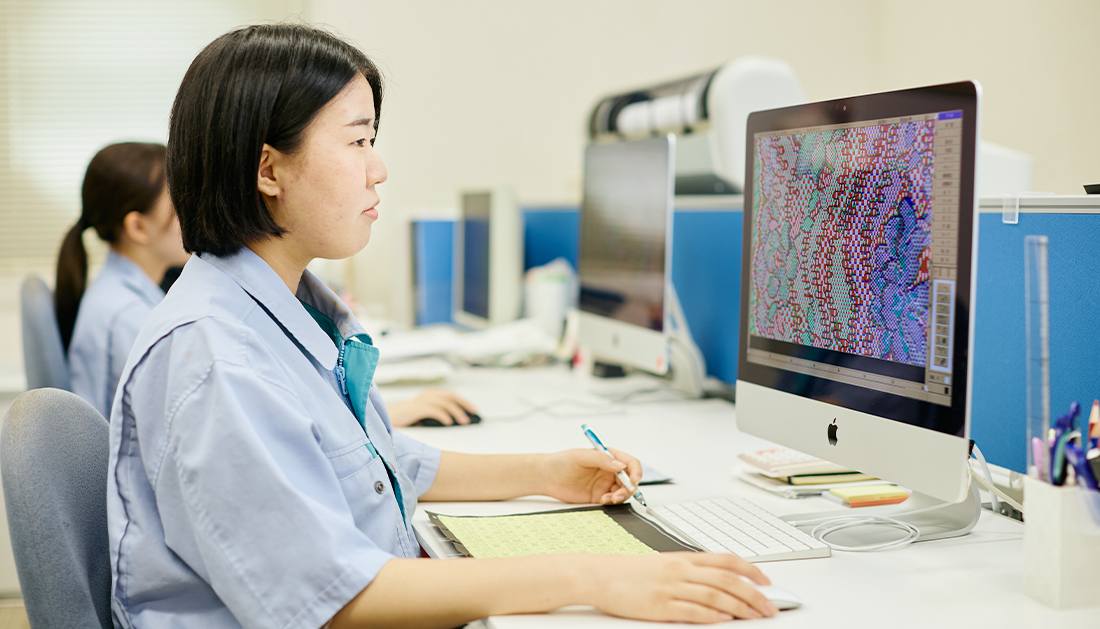 デザイナーが描いたきれいな図案通りのレースになるよう、どうやって糸をはしらせるか考えながらパソコンでデータにおこしていく分解・修正という作業です。