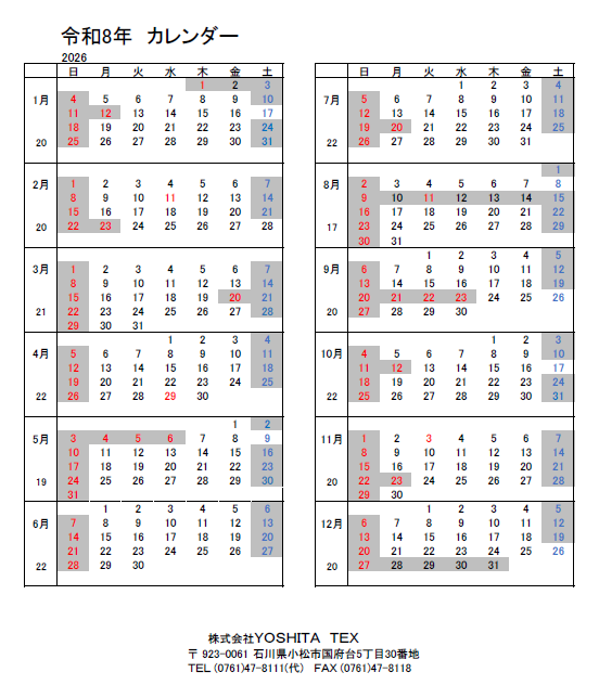 2026年(令和8年)の営業日カレンダーを更新しました。